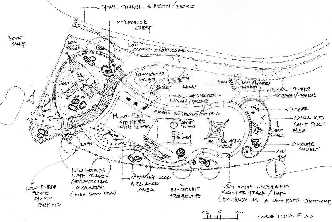 Nicole Tune: I have to start with a hand drawing. It’s the quickest and best way to organize my ideas about a space and get what’s in my head down on paper and see what will work and what won’t. I think once you start drawing you can literally feel the movement within the space. Movement and circulation are such an important part of public spaces and play spaces, and moving your pen over the paper captures that motion.