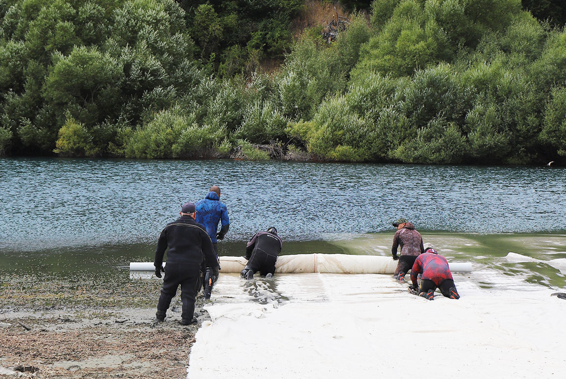 Early research demonstrated that hessian was fit for purpose in New Zealand’s freshwater systems. Since then, LINZ have laid more than 65 hectares of hessian matting in Lake Wānaka and the Kawarau River, with contractors refining techniques improving efficiency. Divers can lay up to 3,750 m² of matting per day under ideal conditions.