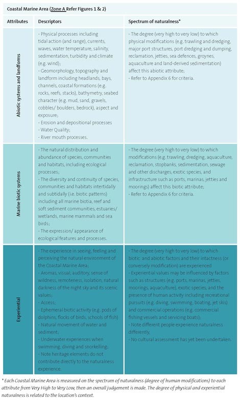 Furthermore, the three categories (or attributes) can be listed or described as follows (these examples were used for the Marlborough Coastal Study and subsequent other coastal studies undertaken by Boffa Miskell). Zone A was the marine area and Zone B the terrestrial area.
