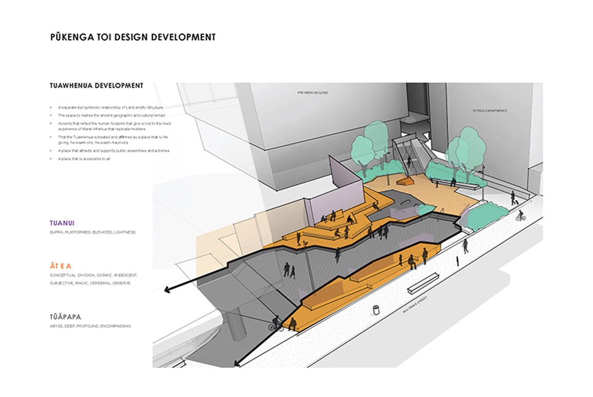Representatives from Taranaki Whānui Te Atiawa and Tihei design studio, led by Rangi Kipa, worked with the design team from Boffa Miskell and architects Warren+Mahoney through a Te Ao Māori co-design process that sought to integrate identity, values and stories within the design of the building and the plaza surrounding it, thus connecting the new construction to the whenua and the original people of Pipitea Kainga.