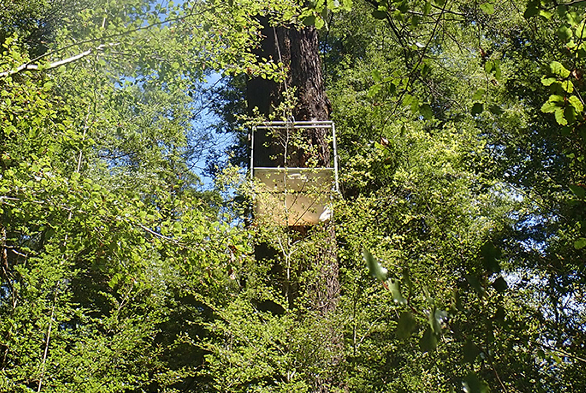 As long-tailed bats usually change roosts nightly, high frequency transmitters are used to locate new trees each morning. Bats are initially caught in free standing harp traps (a specialist bat trap made of parallel strands of fishing line which is undetectable by echolocation) to attach a transmitter to a lactating female. The following morning, she is radio-tracked to a tree and a potential roost hole is identified. Traps are set up covering the roost entrance and the waiting game begins.
