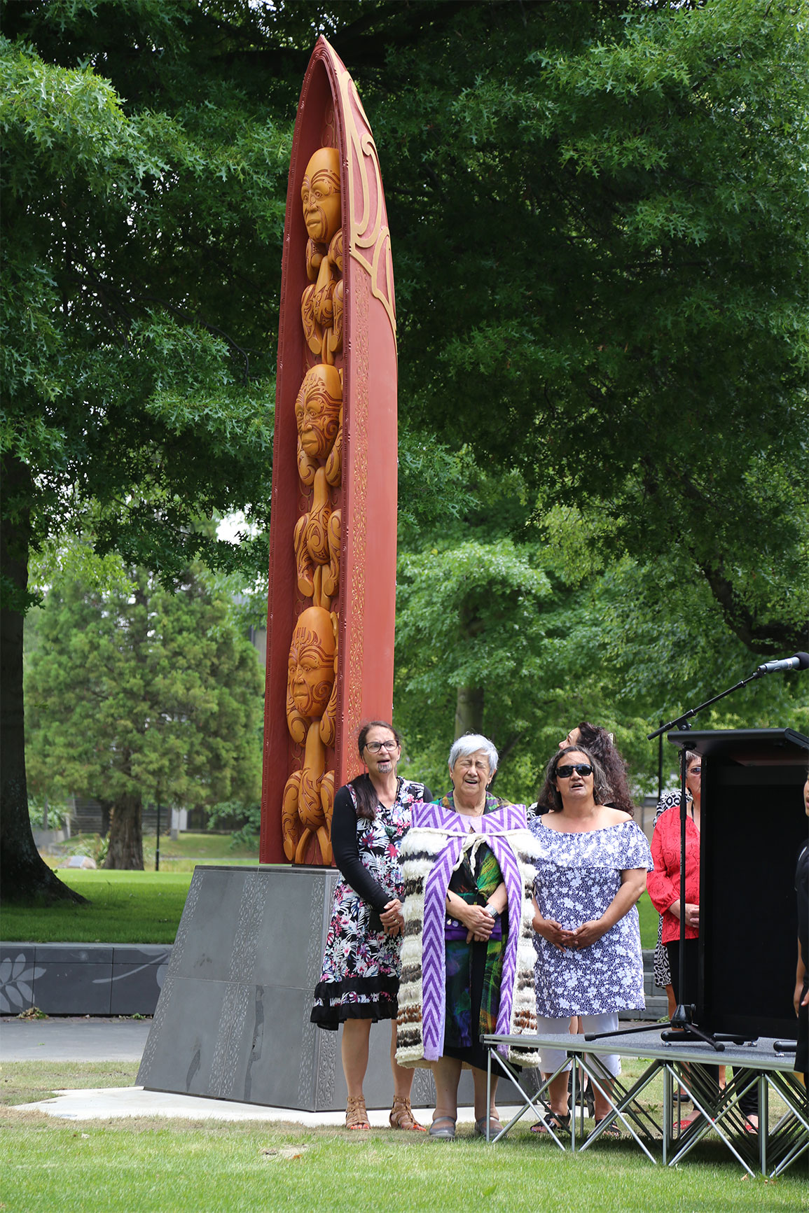 “The carved forms reflect the moko worn by signatories of the Treaty. This artwork portrays the mana of the signatories and supports the Treaty relationship between Ngāi Tūāhuriri/ Ngāi Tahu and the Crown.