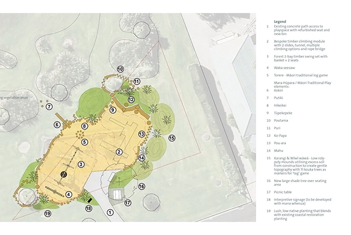 “Listening to the pūrākau, finding ways to authentically express the themes contained in them through the selected ngā aro takaro, and also through the placement of the objects and the selection of materials and planting that surround them, is unique to each place and therein lies the difference,” says landscape architect Aynsley Cisaria.