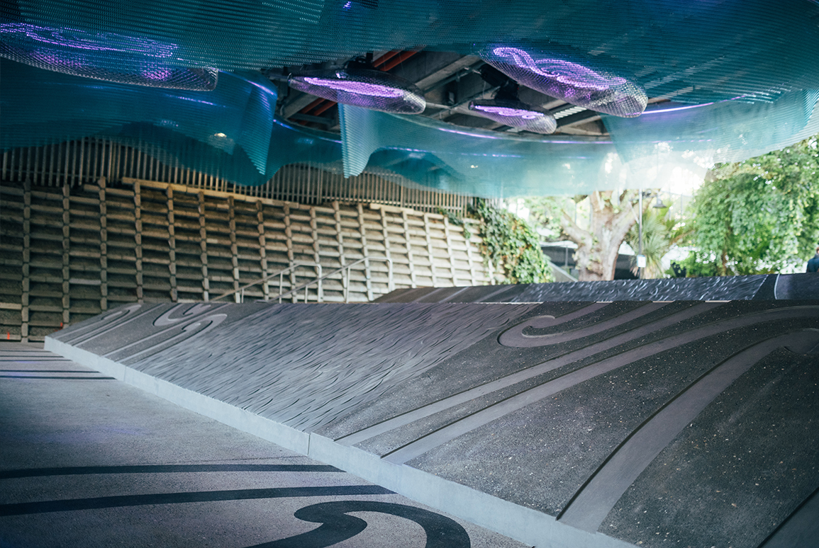 “The team at Boffa Miskell were presented a highly challenging site, and the judges commend the hard work and dedication which is evident in the final product at Myers Park. Graham Tipene’s Waimahara installation and the use of a soundscape environment, allows for a dynamic and dramatic experience. This is offset by the clever and considered use of materials, sizes, level changes and edge details through a typically difficult underpass space.