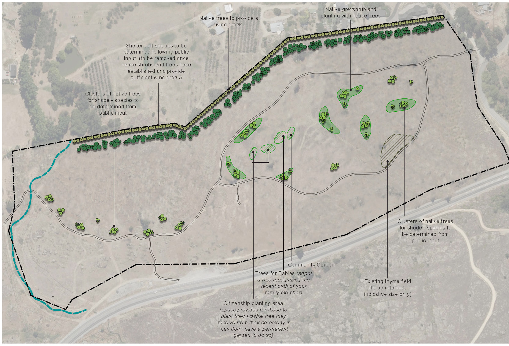 Native tree planting is proposed along the northern boundary to provide a break for the residents to the north from the prevailing southerly winds. A shelter belt is proposed behind the native planting to provide a quick and fast-growing wind break that can then be removed once the natives have established.