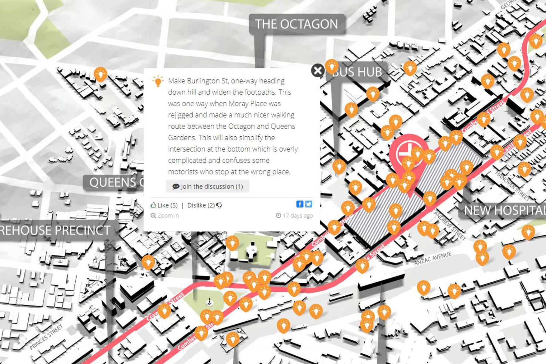 All comments and feedback made on the website were made in real time and remained visible to other visitors to the site. This made it easy for people to read other people’s comments and opinions and engage in a ‘live’ discussion. This transparency also enabled the Connecting Dunedin partners and client team to review comments and ideas as they were made.