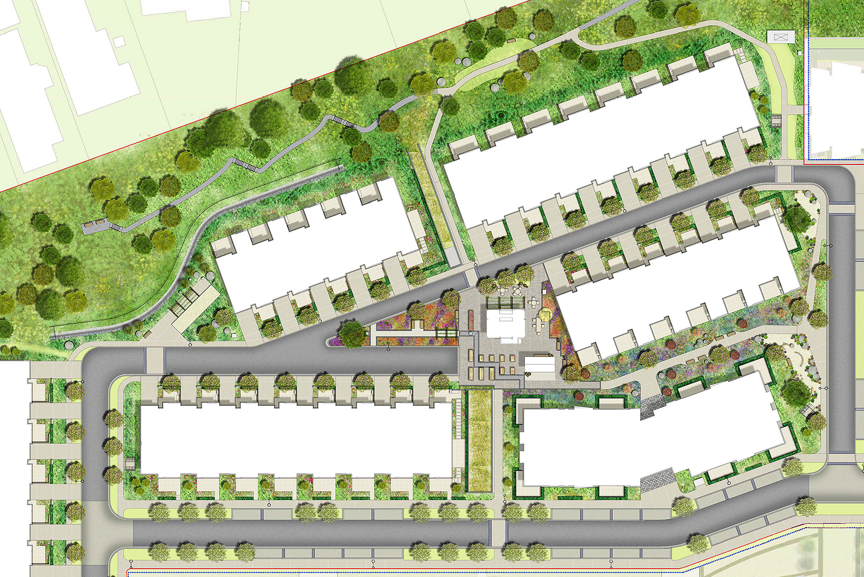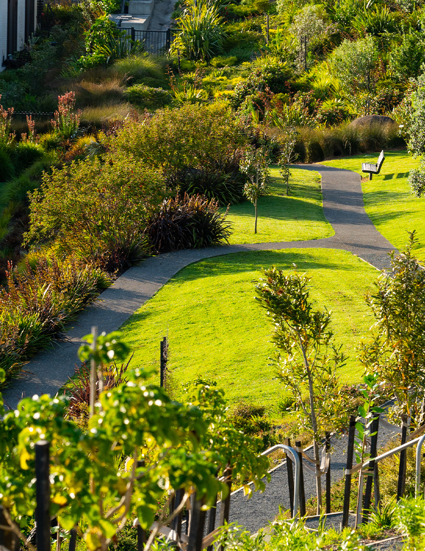 Work on the design of the landscape areas also began at an early stage, with the resource consent plan being developed and revised through the completion of the landscape works on site. Careful consideration was given to both the function and appearance of each communal area, and the outdoor spaces of the village as a whole.