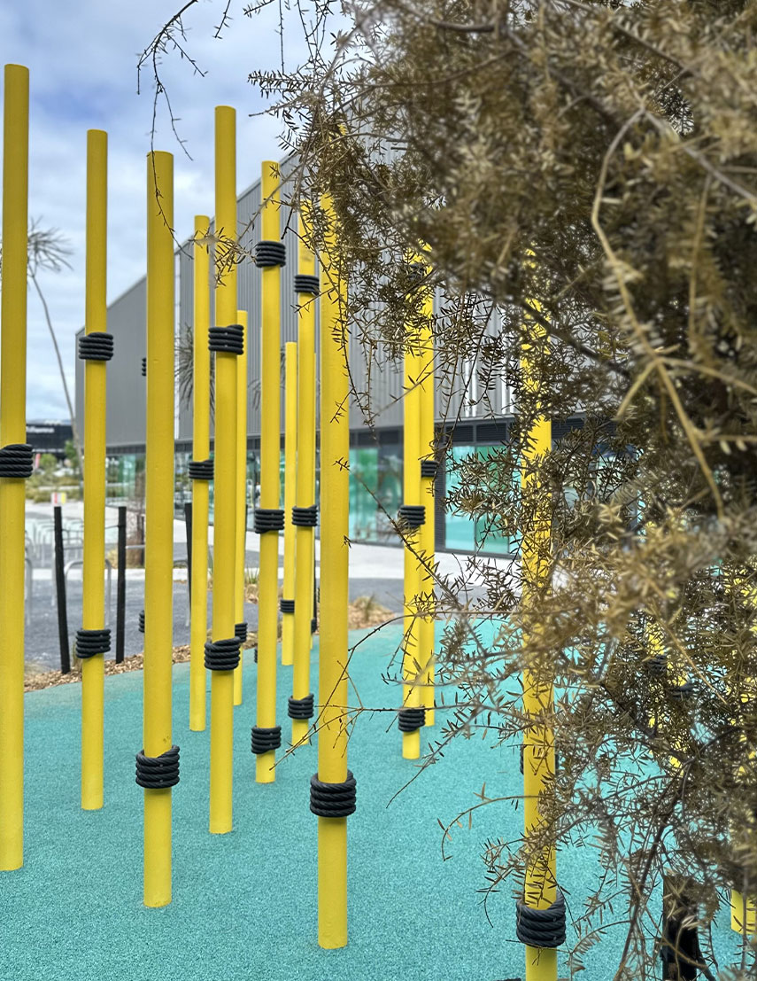 Informal opportunities for jumping, climbing, and play for all ages and abilities are key components of the landscape and entry experience to the Centre, with tether-ball, balance beams and climbing poles provided along with a suite of street furniture to encourage people to enjoy the spaces outside the facilities buildings. Custom, colourful fence posts and Ronstan fence and balustrade netting play further on the idea of the Raupō Creek and harvesting tuna/eels.