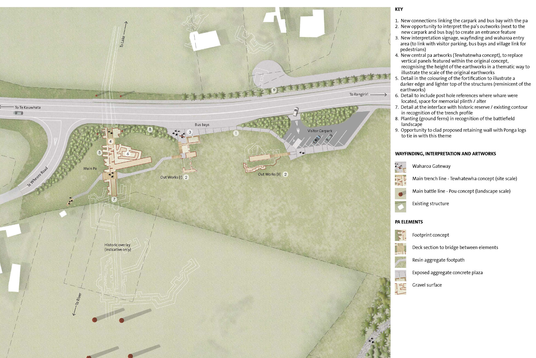 The memorial reinterprets the footprint of the original pā trenches and lines those trenches with retaining walls using timbers carved by a Maori artisan to reflect part of the symbolism of the pā and the Kiingitanga movement.