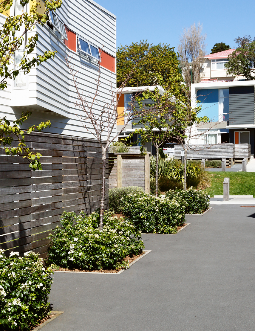 The landscape design reinforces the feeling of community that is created by the arrangement of housing units around the central open space, with its bioswale. This attractive and sustainable design element treats stormwater and gives unique identity that references to the hydrology of the site. Defined and well-lit walkways with identifiable private front and rear courtyards that clearly demarcate private and public space are expressed in the landscape to give a safe environment to those who live and visit the site.