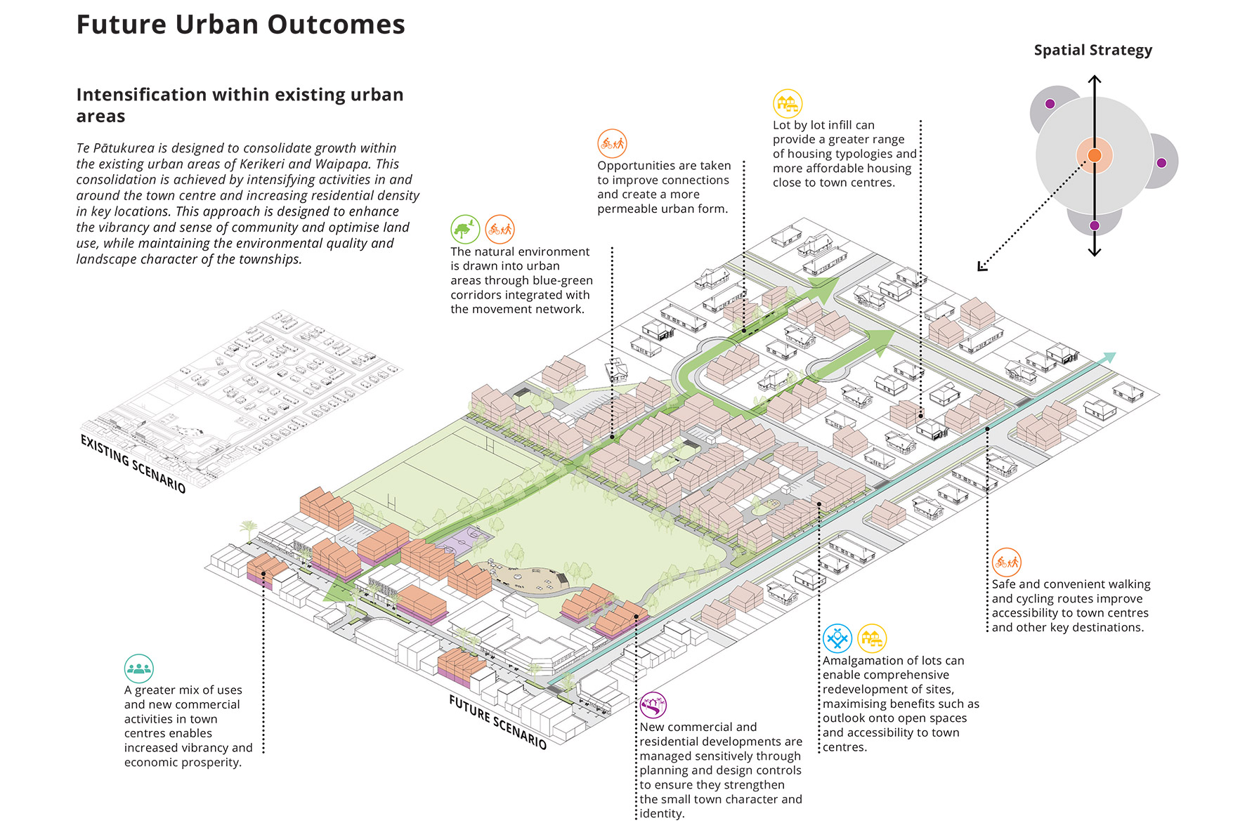 The Te Pātukurea Kerikeri Waipapa Spatial Plan addresses managing significant growth pressures, preventing excessive urban sprawl, efficiently using existing infrastructure, and ensuring that new development contributes to walkable, well‑connected neighbourhoods. Developing preferred growth scenarios required detailed urban design analysis and multidisciplinary input through a structured multi‑criteria evaluation. A core principle of the spatial plan is that most growth should occur within the existing urban footprint to create a more sustainable pattern of development over the next 30 years.