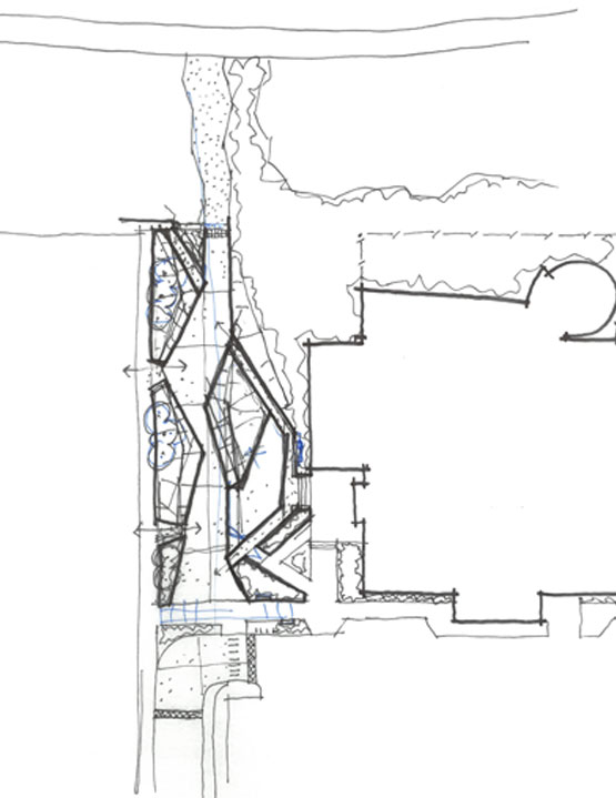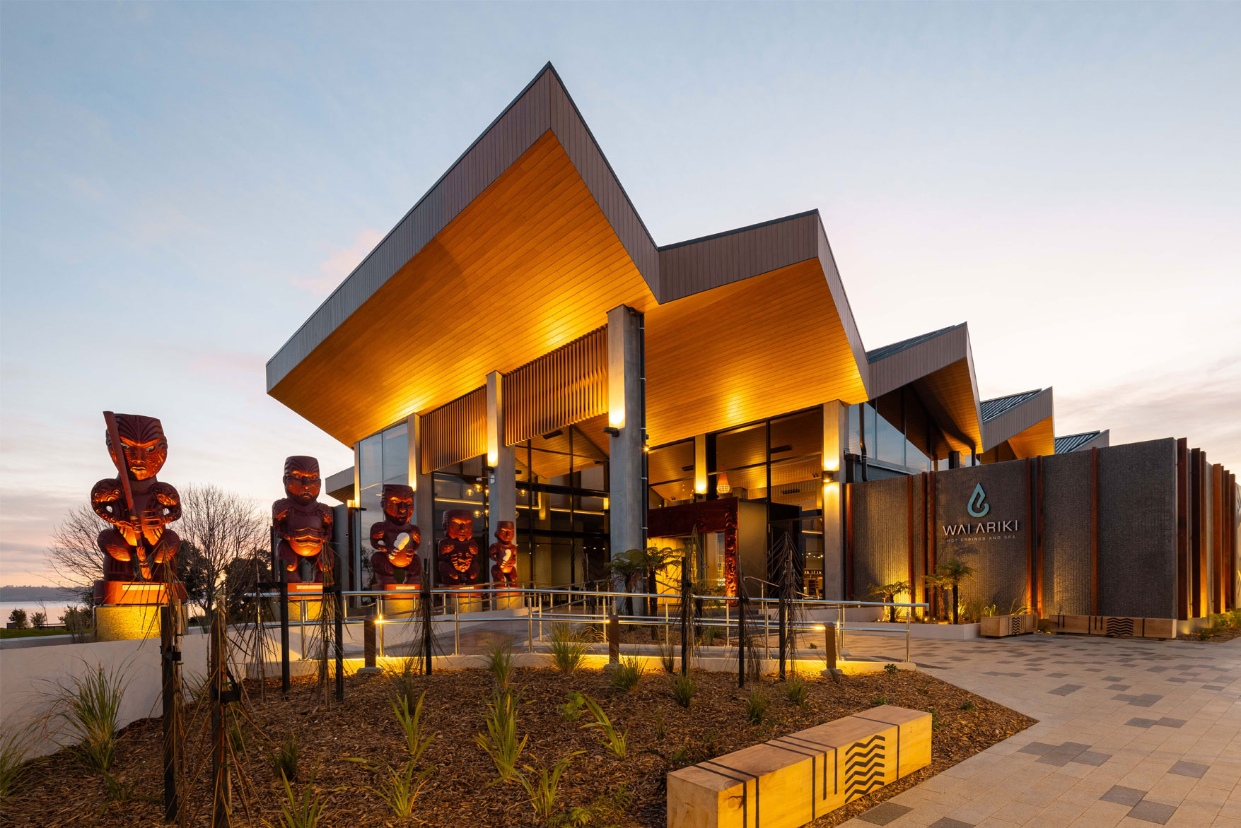 The western façade of the building is enhanced by a deep buffer of rich native planting. The circular geometry of the building is echoed by the placement of three low arching walls set within the planting. Within the planting also are placed the three cultural markers and these provide a backdrop for the perfect photo opportunity for visitors. The planting surrounds the western façade with large Ponga trees located at the base of the building, providing height and blurring the interface between the built form and the landscape. A further four cultural markers can be found as one moves towards the northern entry of the Spa. The planting flows from the building out towards the lakefront, settling into its context.