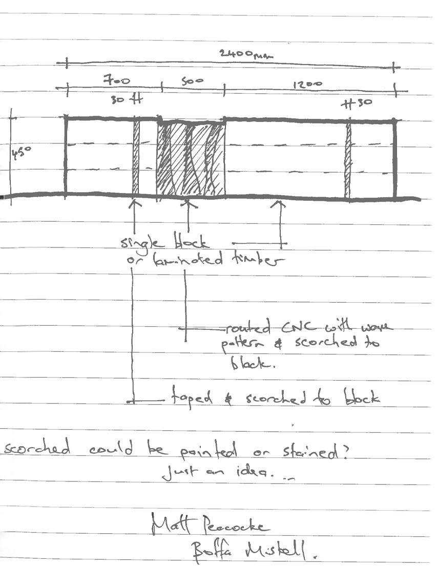 The southern façade of the building is grounded into the landscape with planting and social seating spaces, adjacent to the main entry of the building. Landscape materials are robust and easy to maintain, as well as being utilised to celebrate and recognise cultural and ecological elements. Within the ground plane a below-ground geothermal feature is celebrated using a surface material change (colour/texture) and a decorative etching or plaque within the ground highlights this unique feature. This also allows a flexible paving system whereby pavers can be removed and the geothermal vein can be accessed. Seating elements along the front of the building are large embossed timber beams designed to complement the architecture of the building, whilst touching upon the story of the geothermal activity of the site through abstract hints in colour and form. Tree planting along the frontage provides some height and a green canopy, welcoming visitors to the building entrance, and creating a soft green vista for when they leave.