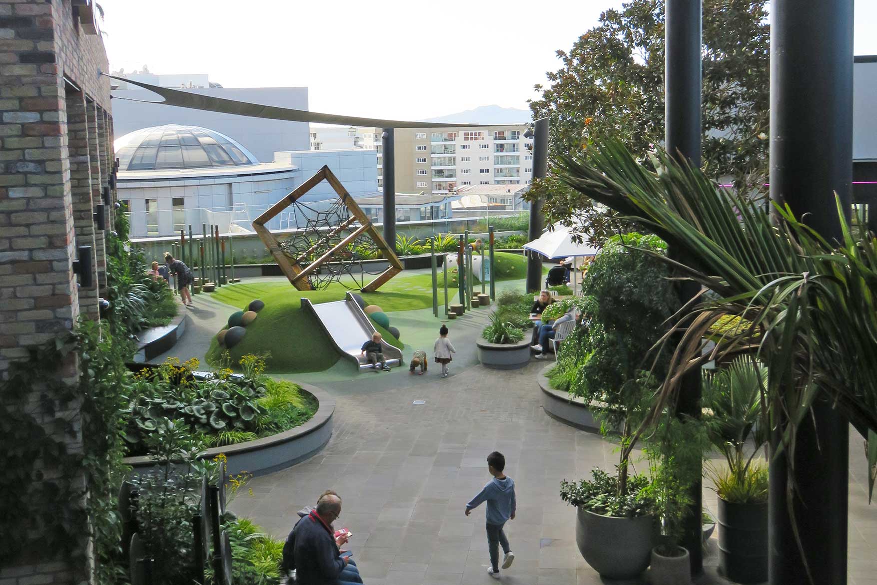 The playspace was designed to appeal to a wide range of age groups, providing a fun, challenging and visually appealing area for children to enjoy whilst their parents shop, chat and relax in the surrounding eateries. The centrepiece is an architectural timber and rope climber, set into an undulating mounded landscape. Tunnels through the mounds entice younger visitors to explore the ground plane, while rock climbing holds provide challenging routes up the mounds and over the tunnels, culminating in a wide slide to zoom back down again.